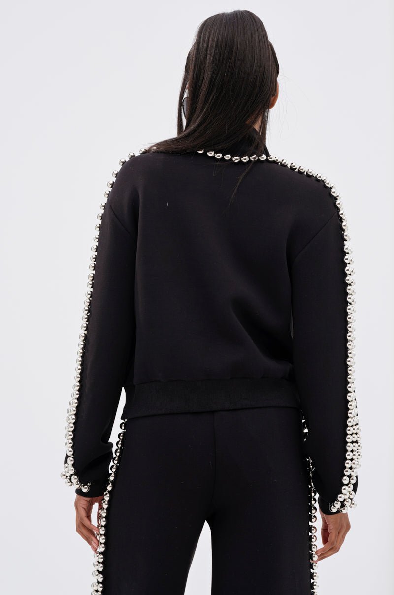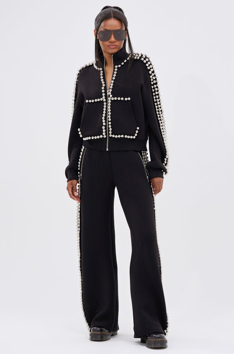 Push your style to the edge in The AKIRA Label Balls To The Wall Zip Up Sweatshirt in Black. This bold zip-up is crafted from a stretchy, heavyweight knit blend and features ribbed knit hemlines, a mock neck, long sleeves with cinched cuffs, and oversized silver ball embellishments that line the sleeves, shoulders, and hemlines. Complete with two front pockets, a metallic front zip closure, and a relaxed silhouette. Style with the coordinating AKIRA Label Balls To The Wall Jogger In Black, leather slides, and metallic accessories to elevate your loungewear game.
