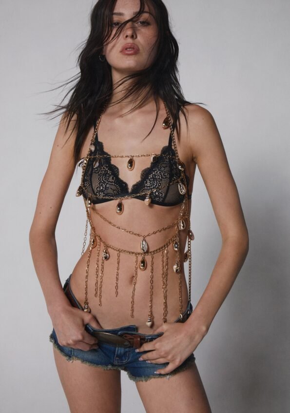 Step into the world with this harness top that has a chainlink construction, beaded fringe seashells with a gold finish on the front, and lobster claw clasp closures on the back.