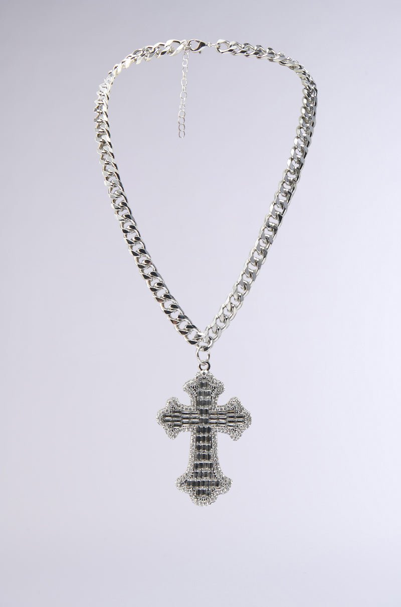 There’s no need to be cross so long as The AKIRA Label Bigger Is Better Necklace exists! Designed with a thick silver Cuban link chain, this statement piece features an oversized cross pendant encrusted with glimmering baguette-cut and round rhinestones and is complete with an adjustable lobster clasp closure. Layer it up or wear it solo—either way, this iced-out cross brings undeniable drip to any outfit.