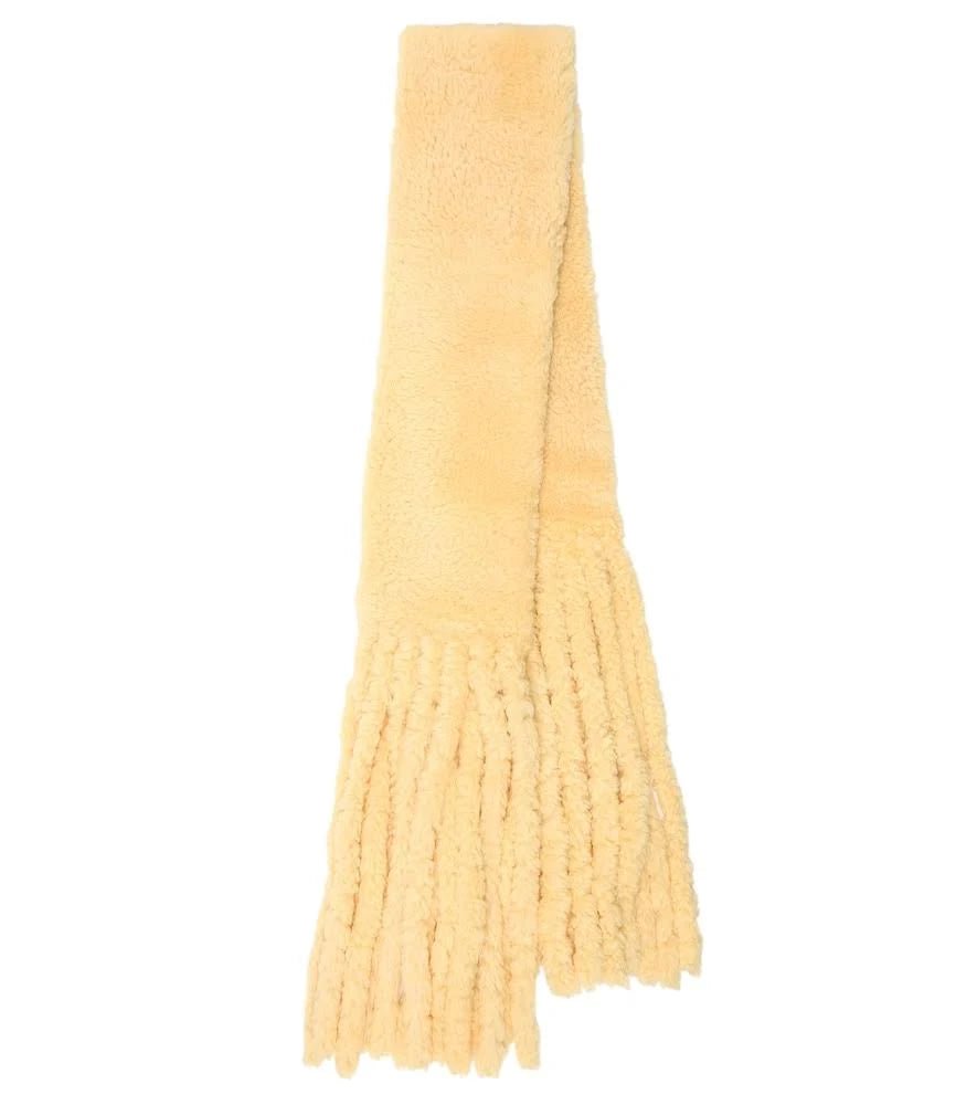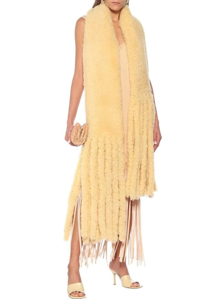 Wrap yourself in understated luxury with this Bottega Veneta shearling scarf, crafted in Italy from ultra-soft lamb shearling. The oversized silhouette drapes effortlessly over the shoulders or wraps snugly around the neck, offering both style and warmth. Finished with delicate tonal fringe detailing, this neutral-toned accessory blends elevated texture with sculptural elegance—perfect for layering over knitwear or tailored outerwear.