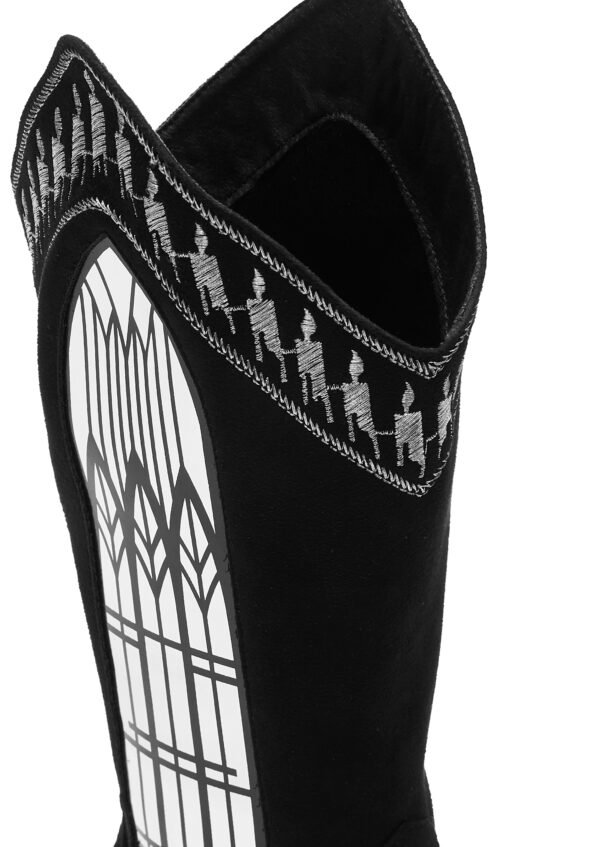 These cowboy boots have a smooth suede construction, a pointed toe design, angled heels, medieval English architecture inspired window appliques on the sides, candle shaped stitching around the top, embroidered crosses on the front, and side zipper closures.
