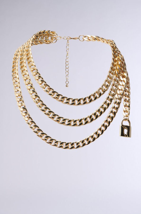 Don’t be afraid to ask for what you want! The AKIRA Label Buy Me This Necklace is crafted from gleaming faux gold and features a cuban chain link construction, a tri-layer design, and a dangling, decorative padlock charm. Complete with a lobster clasp closure.