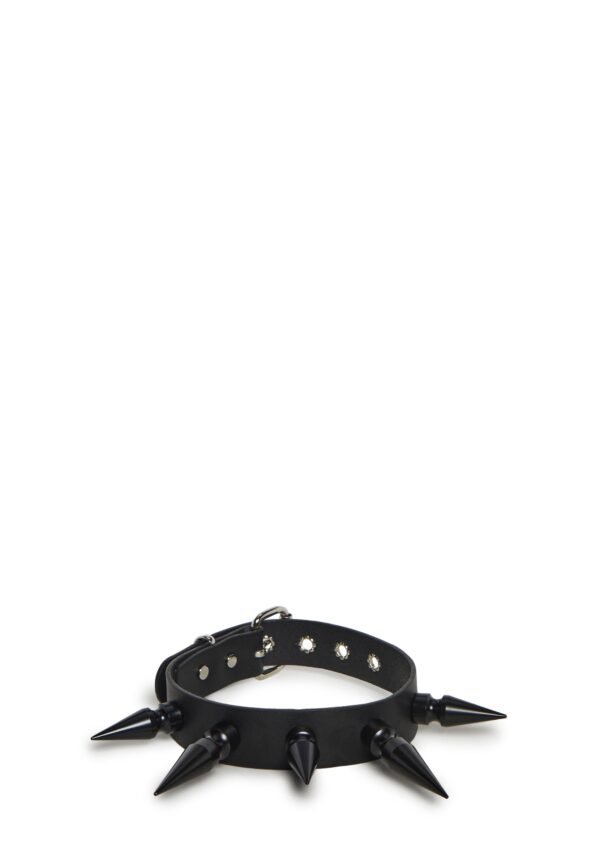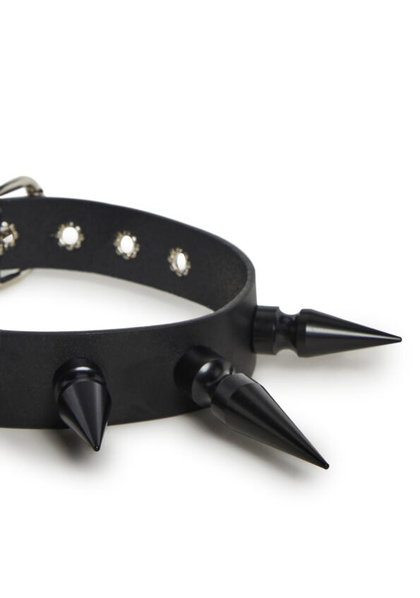 This choker has a vegan leather construction, long spiked details on the front, and an adjustable buckle closure.