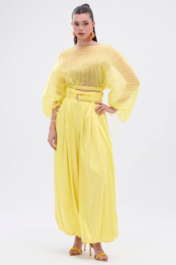 Walking on sunshine when you’re rocking The AKIRA Label Feeling Wild Belted Balloon Pan. Crafted from a luxurious, semi-stretchy satin fabric, these high-rise pants feature a dramatic balloon silhouette with gathered hems and exaggerated pleating. Complete with a coordinating adjustable belt with faux gold metallic hardware, on-seam side pockets, and elasticized pant cuffs. Pair with the coordinating AKIRA Label Feeling Wild Pleated Crop Top, stiletto pumps, and a bold lip for a summery finish.