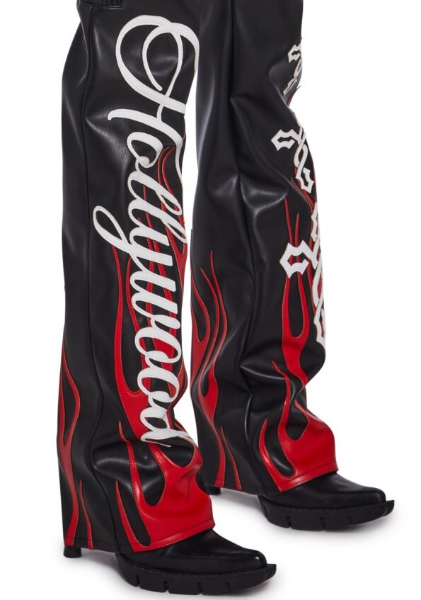 These moto inspired trousers have a vegan leather construction, inner mesh lining, an asymmetrical design with cut out details and adjustable nylon straps, “Glamour” embroidered on the front, two front zipper pockets, flame and cross appliques, and “Hollywood” embroidered on one pant leg.