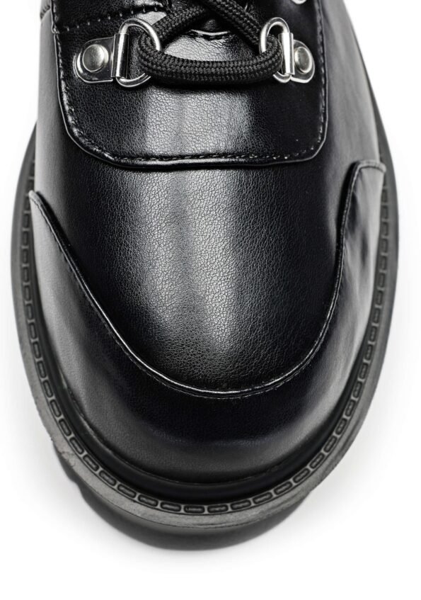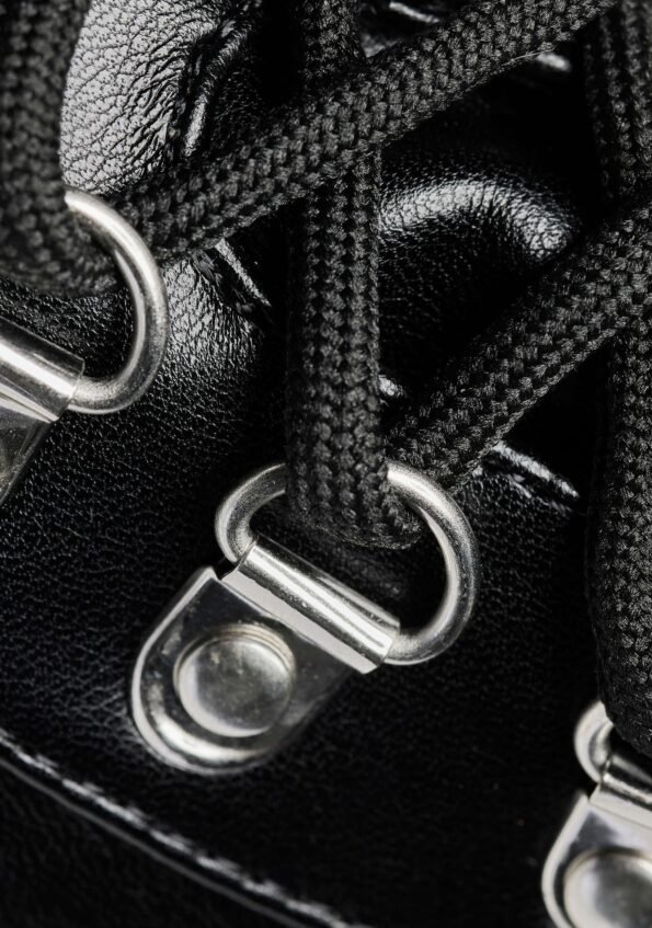 These boots have a vegan leather construction, chunky platform soles, and front lace-up closures.