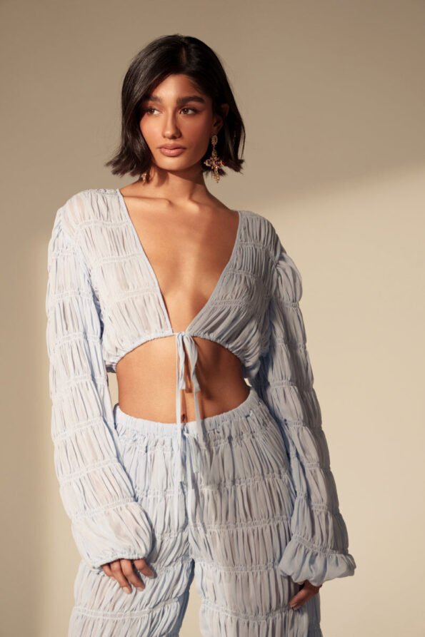 Blue skies are on the horizon with The AKIRA Label Iced Out Tie-Front Top. This breezy blouse is crafted from sheer, delicate chiffon and features a cropped silhouette, a plunging V-neckline with a self-tie closure, long billowing sleeves with cinched cuffs, and a cinched, elasticized hem. The tiered, heavily ruched construction gives this top a boho-vibe that’s ideal for warmer weather. Pair it with the complementary Iced Out Palazzo Pant for a look that screams “free-spirited, but still polished.”