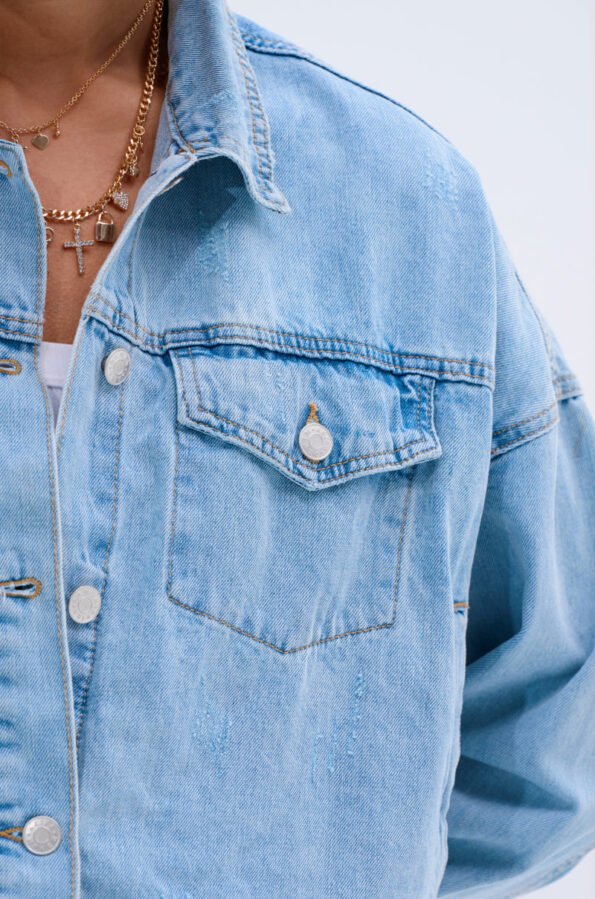 Level up your streetwear with The AKIRA Label Iggy Adjustable Denim Jacket, a reimagined classic with an edge. This cropped jacket features a relaxed, boxy fit in a faded light wash for a worn-in, vintage look. It features a pointed collar, drop shoulders, long sleeves with button cuffs, oversized flap chest pockets, waist pockets, and a button-down front closure. Complete with bungee cord closures at the hemline for an adjustable, cinched silhouette. From casual coffee runs to night-out layering, this jacket will be your go-to for versatile styling.