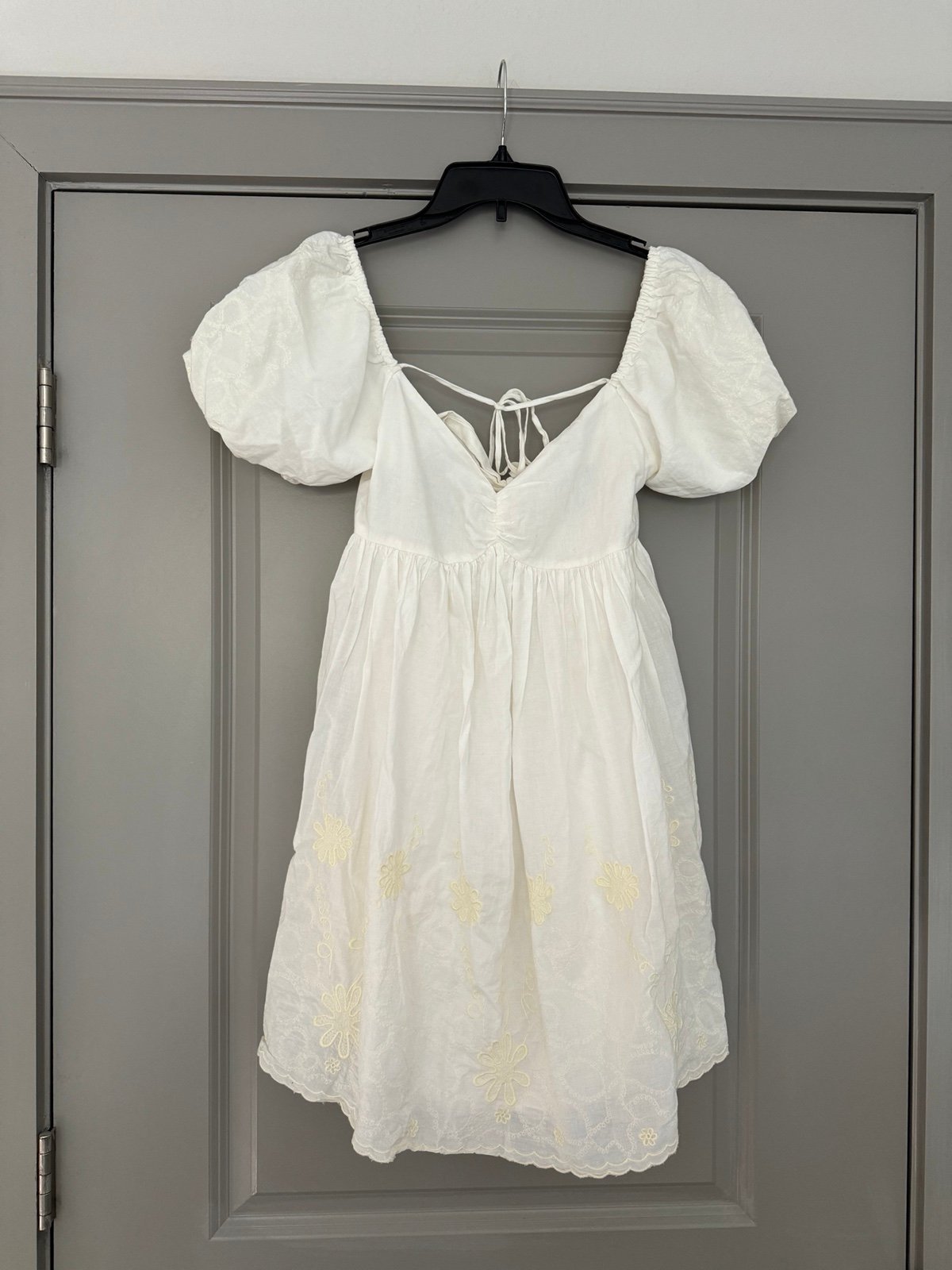 Brand new with tags urban outfitters white puff sleeve dress with bow tie detail and yellow embroidery