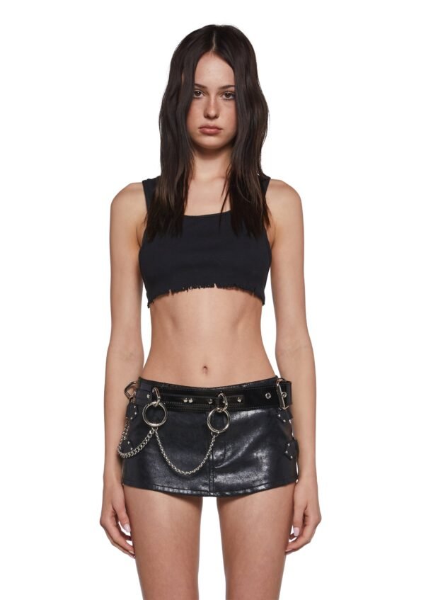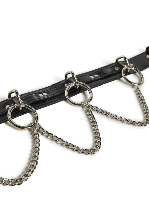 This belt has a vegan vinyl construction, O-ring hardware, chainlink details, and an adjustable buckle closure.