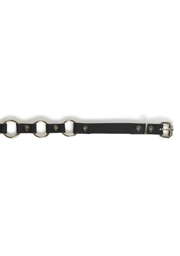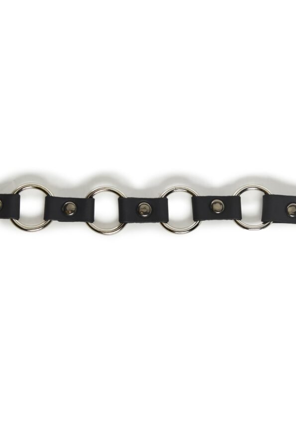 This belt has a vegan leather construction, a ring link design, and an adjustable belt closure.