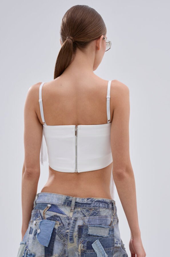 Country girl, shake it for me! The AKIRA Label Shake It For Me Fringe Blouse features a cropped silhouette, a snug, supportive fit, sweetheart neckline, adjustable cami straps, and a metallic zip-back closure. Tiers of cascading tonal fringe add fun and festive flair that’s perfect for concerts or the club.
