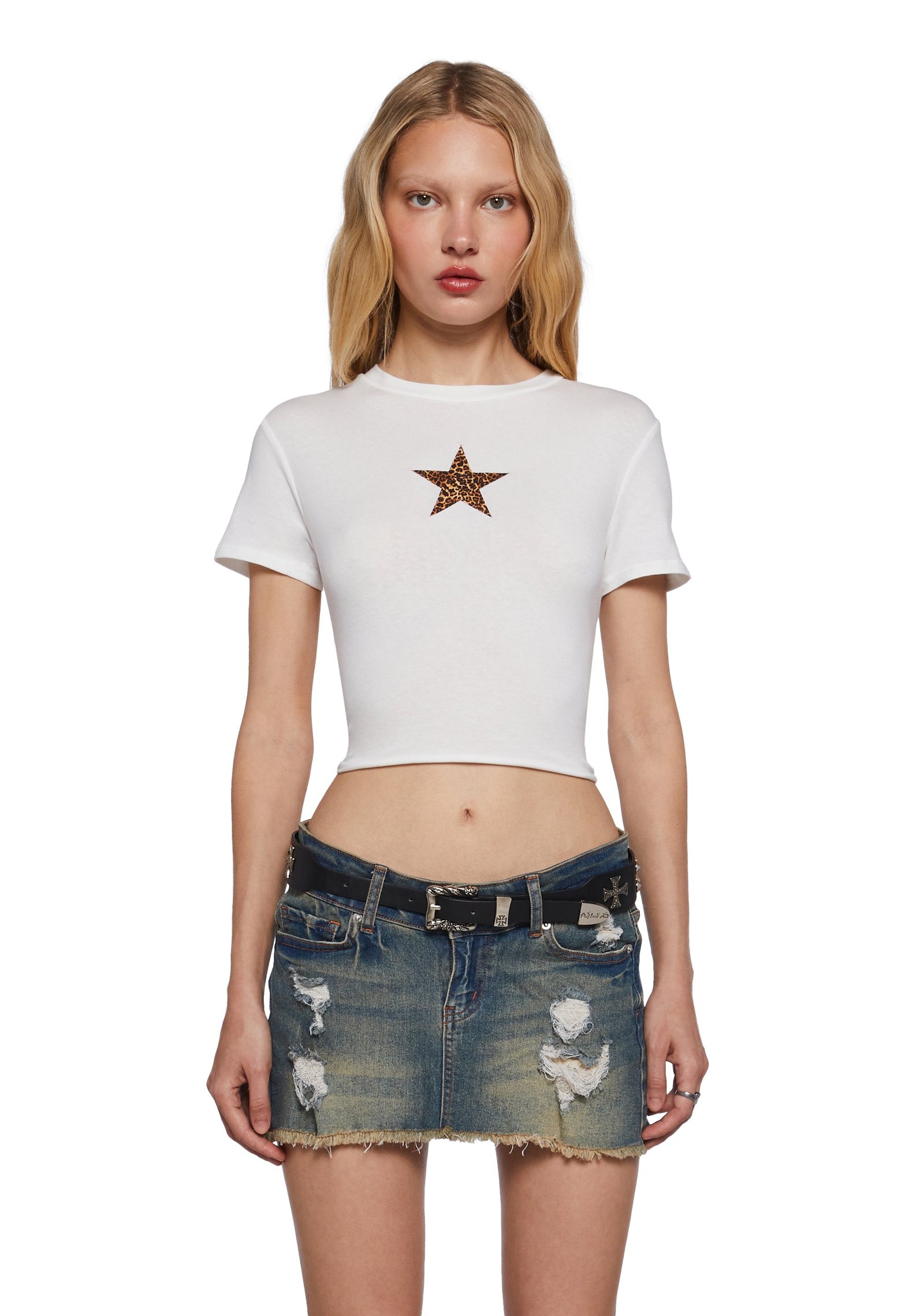Look like a rockstar with this tee that has a crew neckline, short sleeves, a cropped fit, and a leopard star graphic on the front.