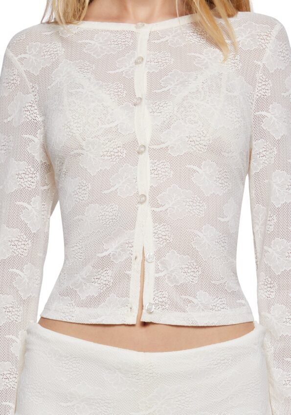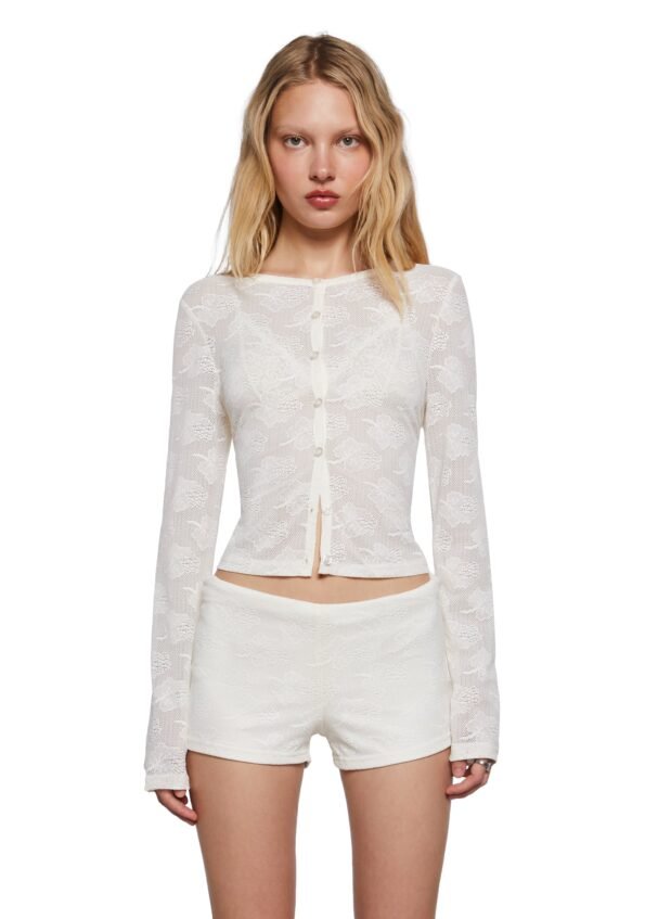 Look stunning in this set that includes a cardigan that has a semi sheer lace construction, an all over floral pattern, long sleeves, a cropped fit, front button closures, and matching shorts.