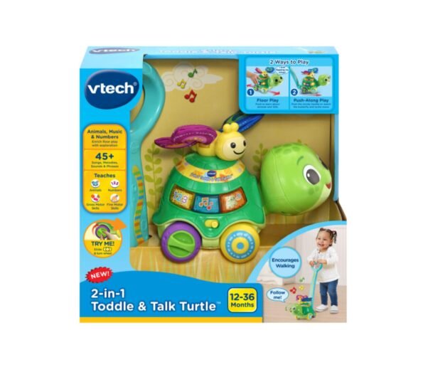 Get ready to wiggle, giggle, and groove with the VTech 2-in-1 Toddle and Talk Turtle! This engaging toy transitions seamlessly from a floor play toy to a fun push-along walker, designed to grow with your child from 12 to 36 months. The turtle features three colorful buttons that teach numbers, music, and fun facts about turtles. As your child begins to walk, attach the removable handle to transform it into a walker and watch as the turtle bobs its head and the butterfly flaps its wings, accompanied by cheerful sounds and music that reward your child’s walking efforts. The VTech 2-in-1 Toddle and Talk Turtle is the perfect companion for encouraging walking, enhancing motor skills, and introducing educational content in a playful way.
