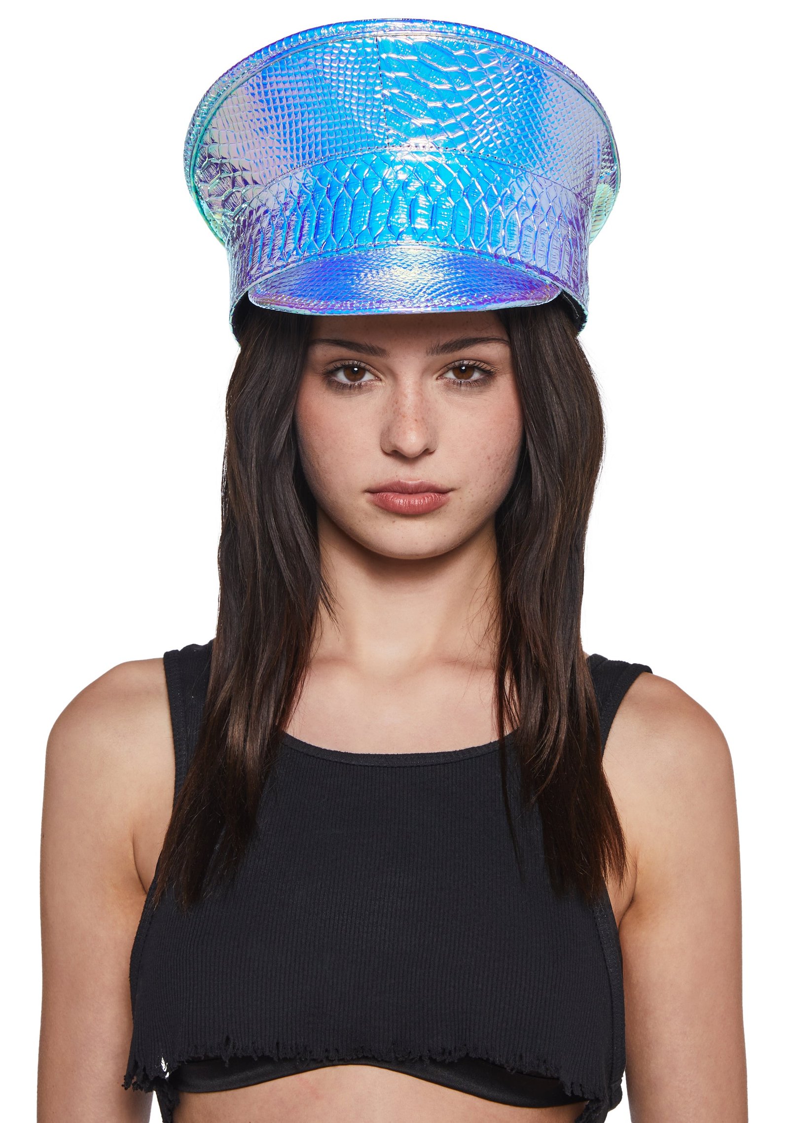 This hat has vinyl construction, an all over snake pattern, an iridescent finish, and an adjustable velcro fit strap on the inside.
