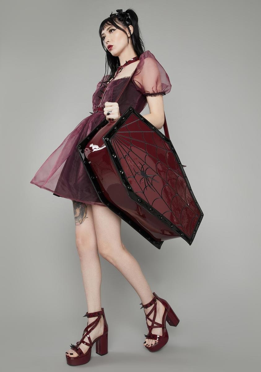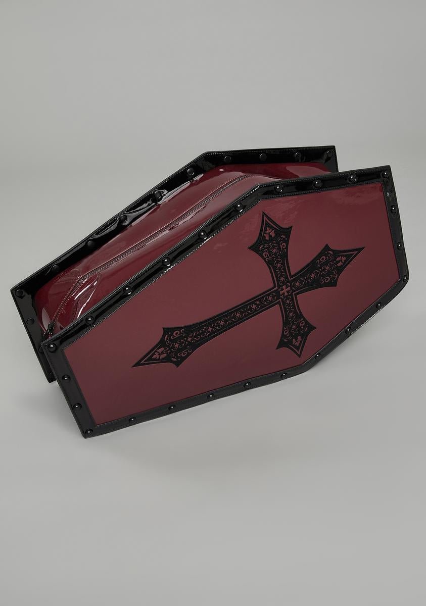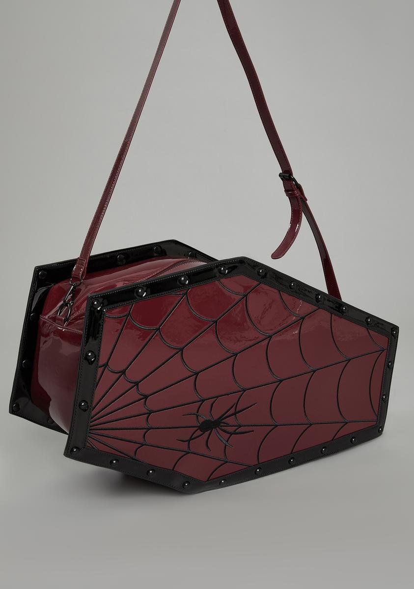 gotcha carrying some precious cargo. Admit it, you’ve got baggage with this twisted patent vegan leather weekender that has a coffin-shaped construction, dark stud hardware, eerie designs on the front N’ back and a full zip closure.