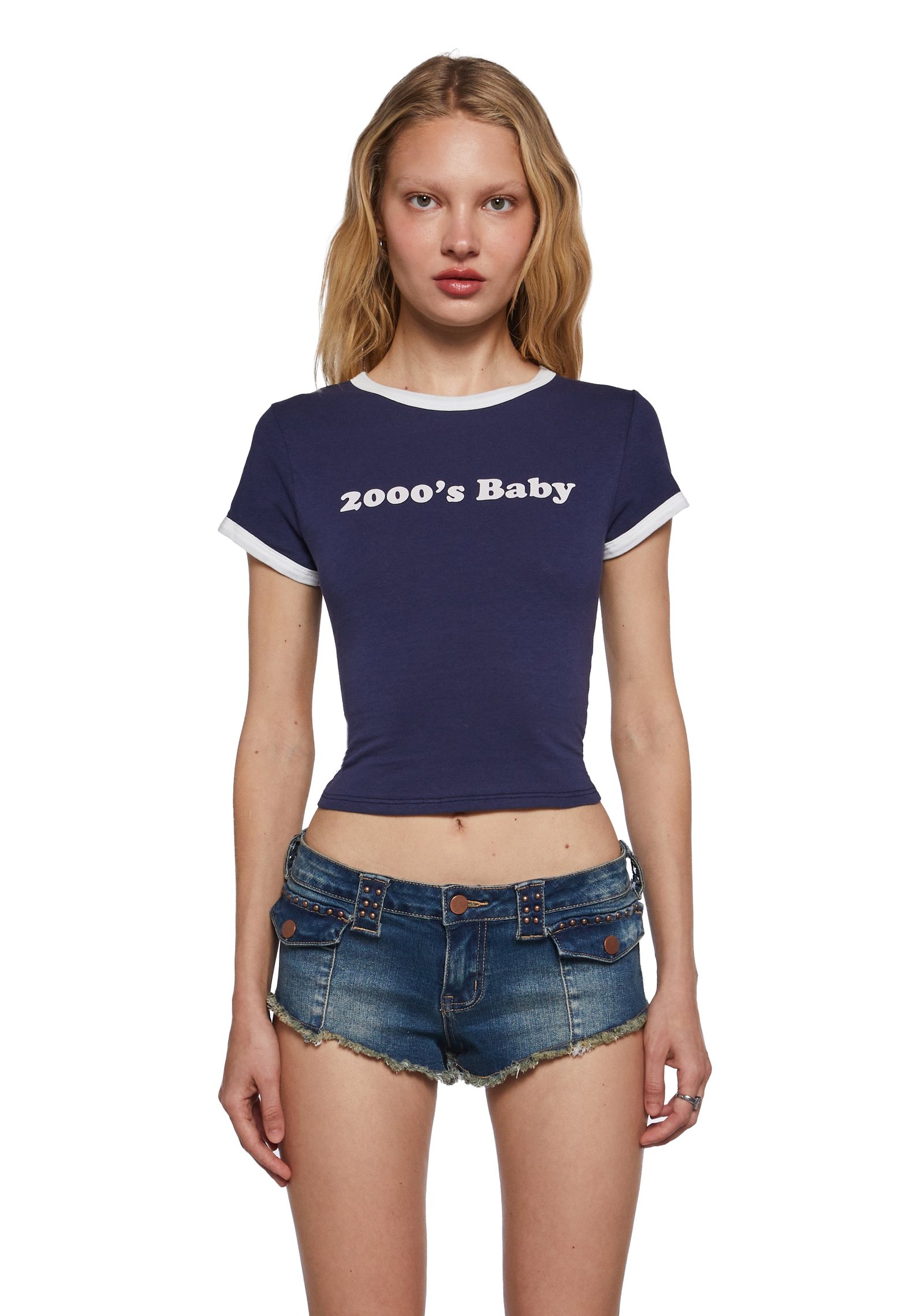 This tee has a stretchy cotton construction, a crew neckline, short sleeves, a contrast colored trim, a cropped fit, and “2000’s Baby” printed on the front.